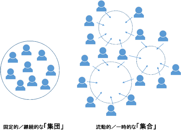 スマホやSNSの普及により、生活者が受け取る情報量が爆発的に増えた昨今、生活者の興味、関心の対象は非常に多岐に渡ります。今の生活者は、継続的、固定的につながる特定の「集団」に属するだけではなく、その時々の興味、関心によって様々な「集合」に引き寄せられます。
